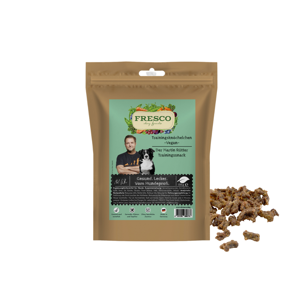 Der natürliche Monoproteinsnack auf pflanzlicher Basis in Form eines Knöchelchens mit dem Gütesiegel des Hundeprofis Martin Rütter ist die ideale Belohnung für Deinen Hund im Training, aber auch perfekt als kleiner Snack für zwischendurch! Auch Martin Rütter hat die Trainingsknöchelchen mit seiner Hündin Emma im Training getestet und beide sind sich einig: Im Training gibt es nur noch FRESCO Leckerlis!