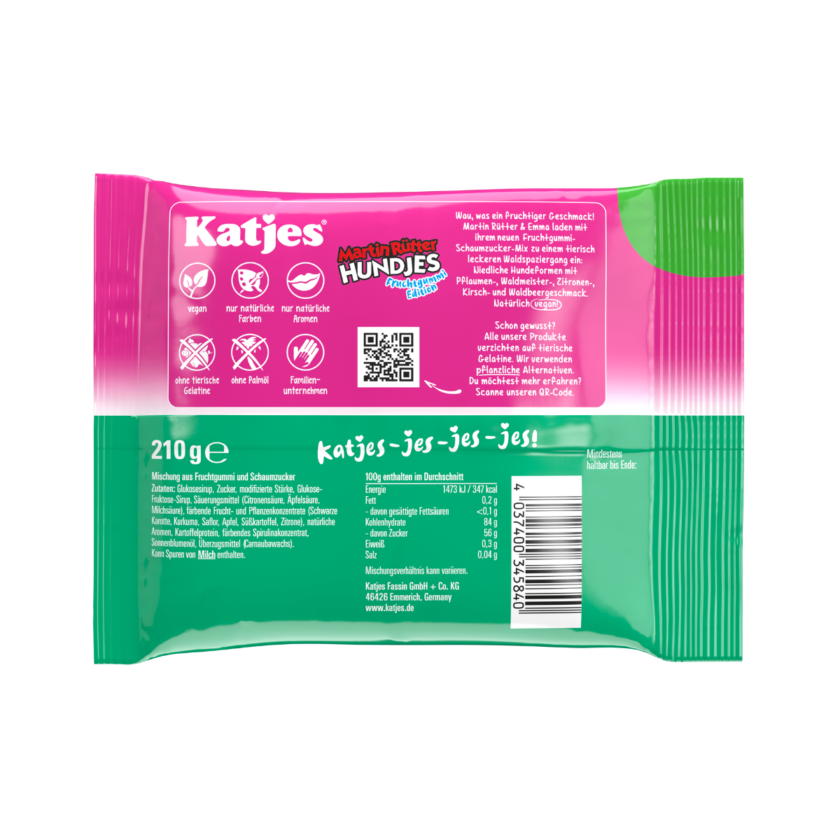 Nach dem Erfolg der Lakritz-Edition präsentieren Martin und Emma gemeinsam mit Katjes die Hundjes jetzt auch als leckere Fruchtgummi-Edition! Inspiriert von einem Waldspaziergang bietet jede Tüte eine bunte Mischung fruchtiger Geschmacksrichtungen: Pflaume, Waldmeister, Zitrone, Kirsche und Waldbeere.